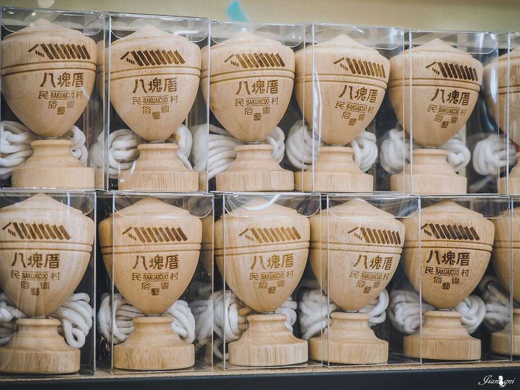 一旁還有文創商品可以逛逛:有捏麵人、捏麵尪仔、蓪草紙花、春仔花、瓷刻….,文創商店販賣的是以台灣味十足為設計出發點的紀念品、伴手禮、工藝家藝術品,眼前的陀螺工藝更是來自舉世聞名的大溪陀螺,展示與販售各種陀螺工藝品,這款陀螺可是八塊厝獨家販售的款式喔!別的地方買不到,喜歡傳統童玩的一定要收藏。