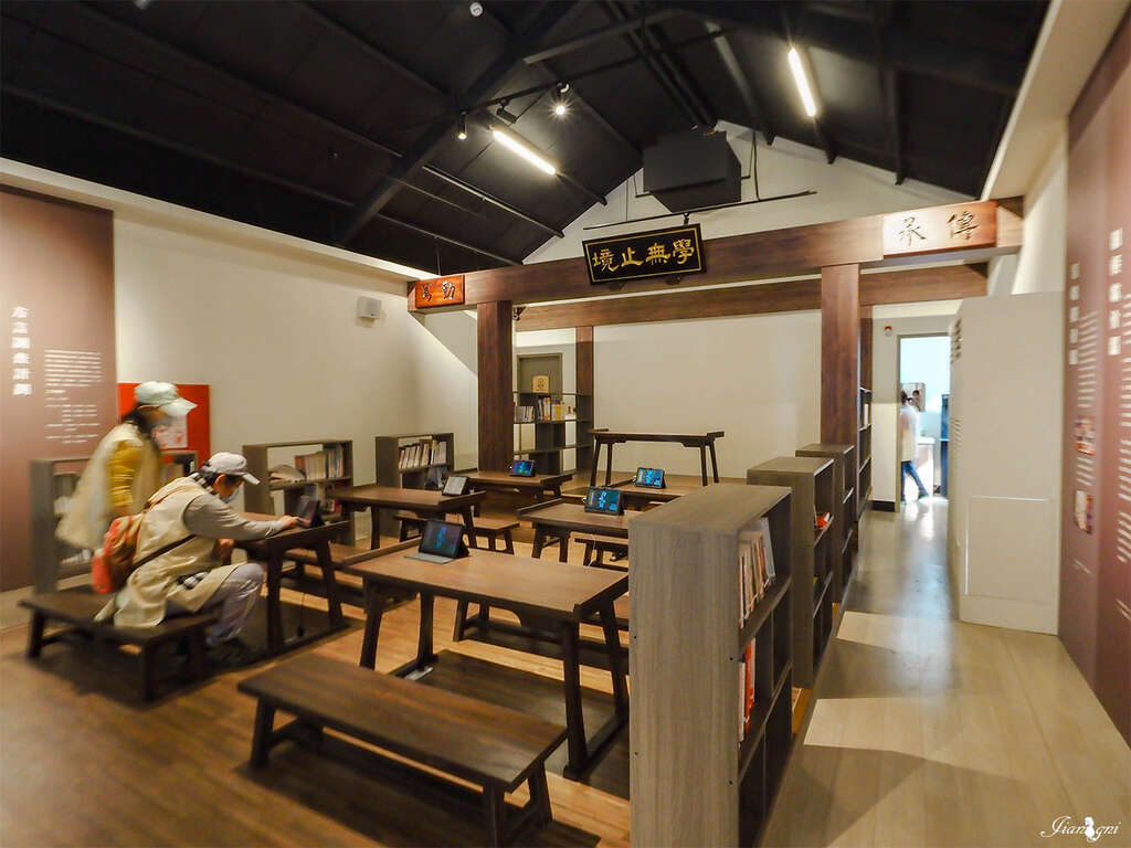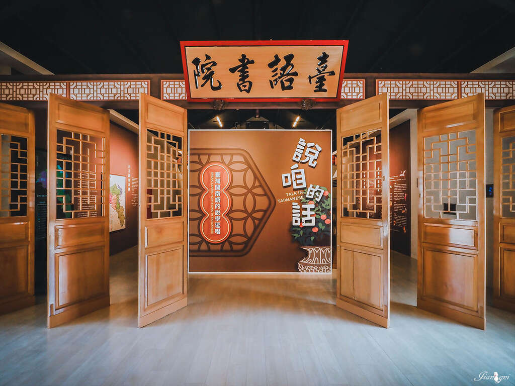 這裡是推廣台灣閩南語的館別-說咱的話,以古色古香來呈現古早書院的氛圍,書架上成列許多台語繪本、書籍、電子書…等,透過說學逗唱的方式,可以更輕鬆學習到閩南語的各種腔調或源流。