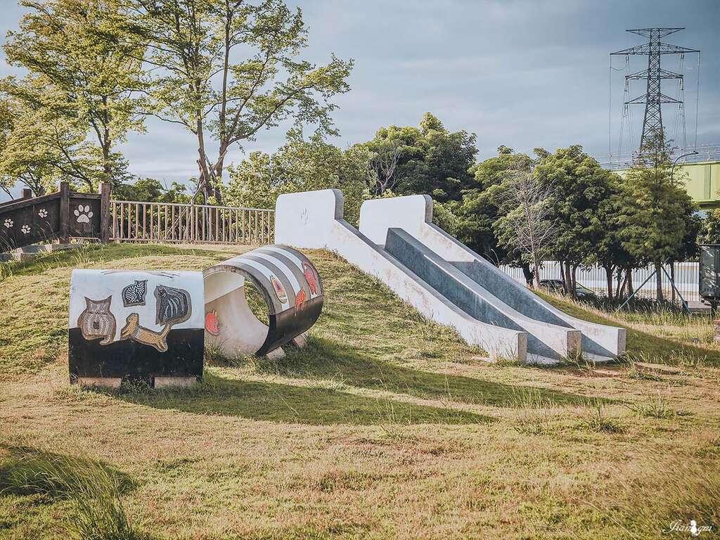 中大公園位在八德區建德路及興豐路口,有寬闊的草皮、磨石子溜滑梯、沙坑、汲水幫浦等,最特別的亮點就是有多個彩繪水管,水管上繪製了不同造型的可愛貓咪,水管隧道也成了小朋友玩起躲貓貓的樂趣!也吸引不少旅人拍照打卡。