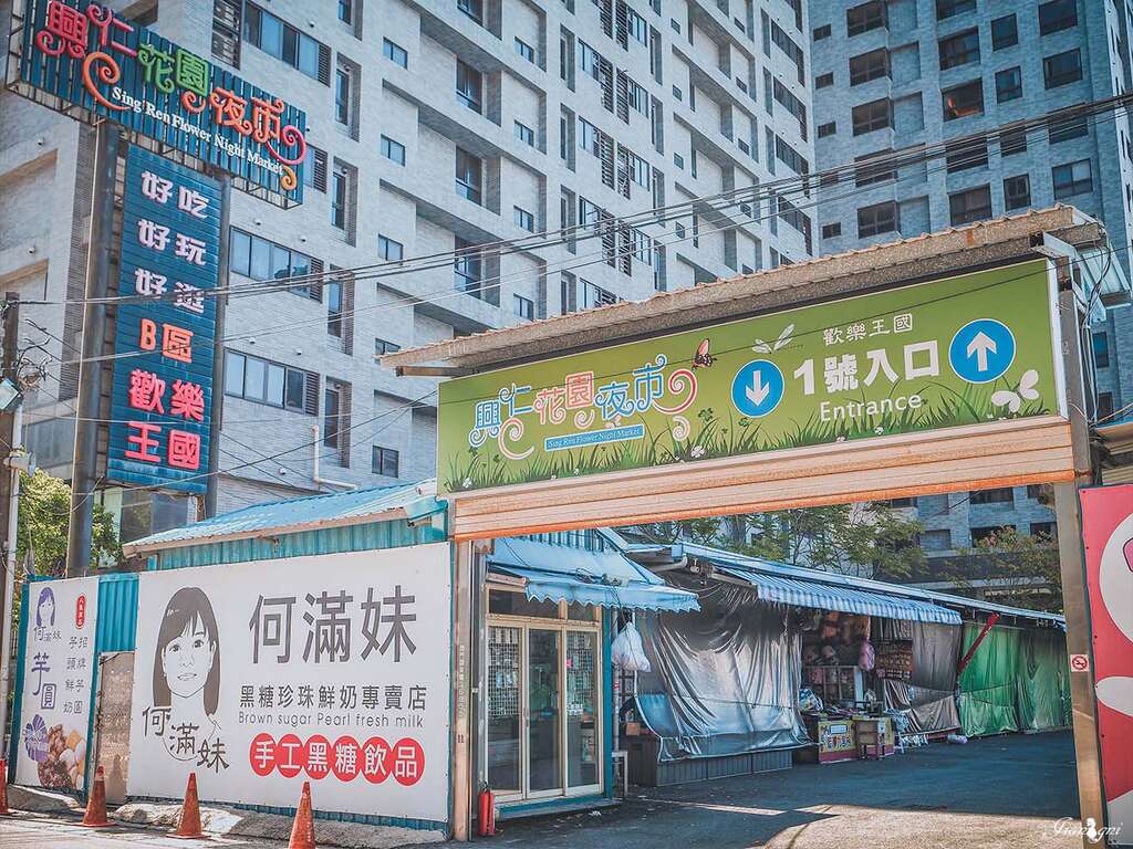 興仁夜市的招牌特色有:比臉還大的酥炸大魷魚,龍眼木現烤的窯烤披薩、老字號的臭豆腐與生炒花枝、香氣濃郁的米食甜點、尺寸如口袋大小的創意牛排、前知名酒店主廚坐鎮的滷味…等;不過記得前往興仁夜市前要注意一下營業時間,以免像我太習慣中壢夜市是每天都有營業,剛好來的這天不是太早、就是休息日(冏)因為距離5點才營業還有點早,很多商家都還在準備食材,只好先來杯滿妹珍奶解解渴。