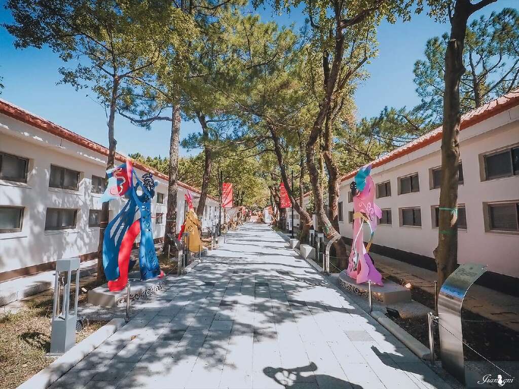 穿過閩式屋梁就來到藝術村裡的民俗大街,兩側以好戲登場八塊厝為主題的裝置藝術,有歌仔戲常見的人物角色:武生、文生、花旦、淨角(花臉)、丑角,象徵戲台上的百態人生。